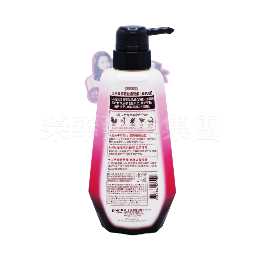 日本抗衰老養髮品牌,蘊含5種天然海藻萃取精華,養潤老化頭皮,強韌髮根,預防掉髮,頭髮稀薄人士適用。高效鎖色因子在髮絲表面形成保護層,順滑髮絲鱗片,鎖緊髮色,令染髮效果更持久。萃取5種天然海藻成分,有效締造健康生髮環境,加強防掉髮功效,頭髮更濃密豐盈。針對染後髮質,加入具滋潤陂伢敊砟族凡珍貴養潤成分及5種天然植物油,深層養潤,令染後髮絲更健康有光澤。