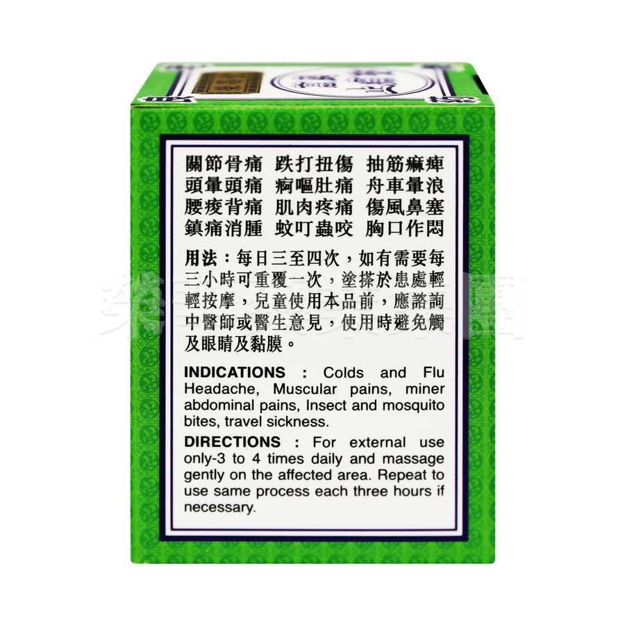 產品簡介: 關節骨痛、跌打扭傷、抽筋麻痺、頭暈頭痛、病嘔肚痛、舟車暈浪、腰痠背痛、肌肉疼痛、傷風鼻塞、鎮痛消腫、蚊叮蟲咬、胸口作悶。