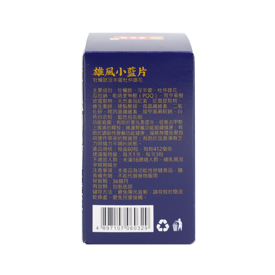 產品簡介: 有助於調節性腺軸功能健康, 緩解身體長期負荷運作帶來的腎疲勞, 有助於改善渾身乏力舆精力不竭的狀態。