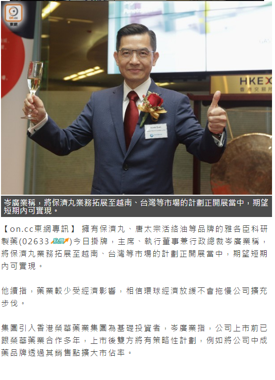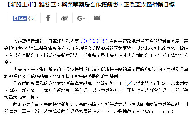 香港榮華藥業集團成為雅各臣科研製藥 (02633) 上市的基礎投資者,預期未來可以產生協同效應,有更多空間合作。
