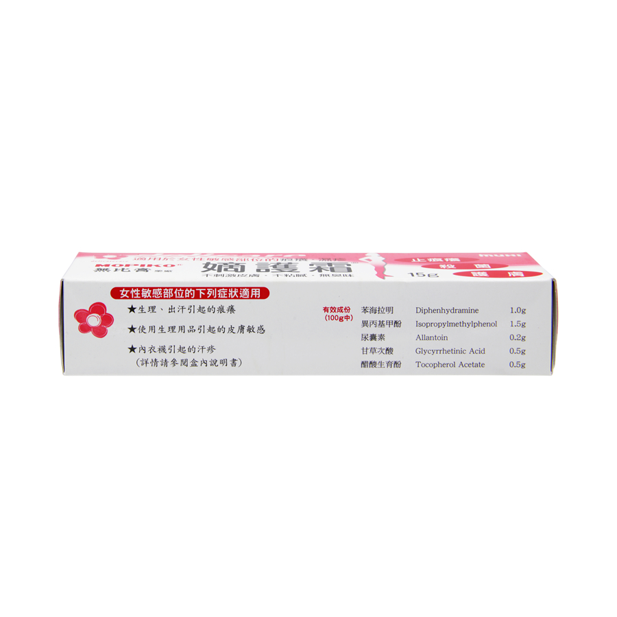 女性的生理地帶易受白帶、汗水及月經期間受內襯褲及衛生巾等生理用品 纖維質的磨擦而引起痕癢、皮膚敏感,使人無限煩擾。若不及早治療而觸 傷後受細菌感染令症狀惡化,煩擾更長期化造成惡性循環。只有及早抑制 痕癢、皮膚敏感,保持肌膚清潔,才能防止惡性循環。本藥膏是具有止癢、 殺菌和護膚三大功效的治療劑。