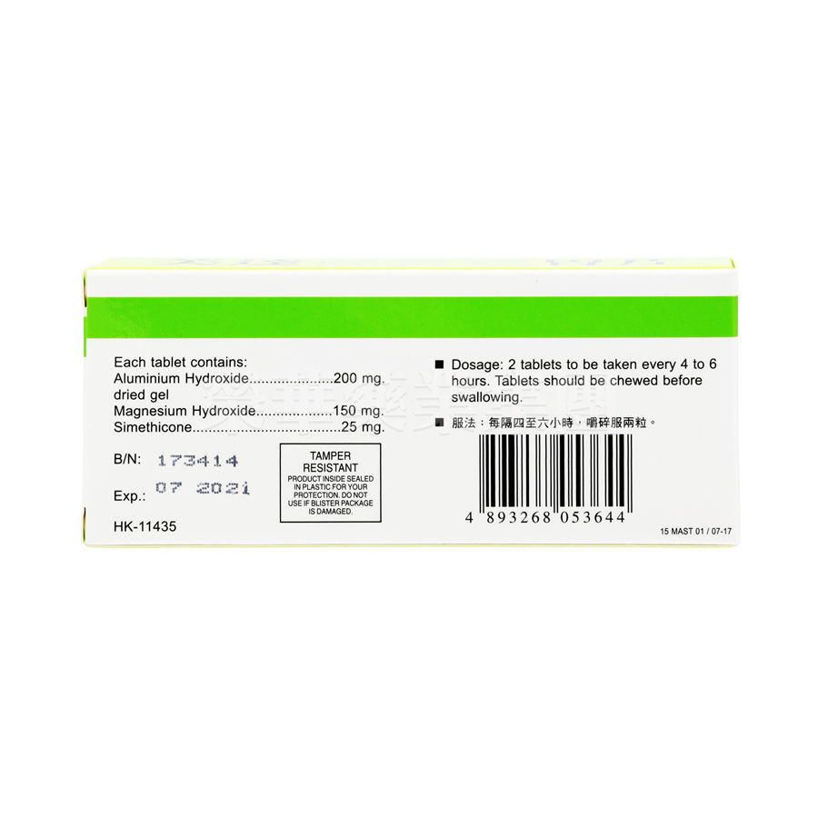 具有抗胃酸及解除腸胃脹氣的功效。專治胃潰瘍引致之痛苦,胃酸過多引致之症狀如燒心、消化不良及腸胃不適。並能排出腸胃內之氣體,解除腸胃及小腹氣脹之痛苦。