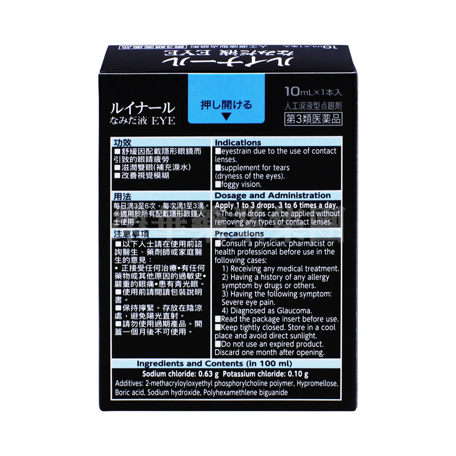 氯化鈉:0.63g氯化鉀:0.10g添加劑:2-甲基丙烯酰氧基乙基磷酰膽鹼聚合物,羥丙甲纖維素,硼酸,氫氧化鈉,聚六亞甲基雙胍