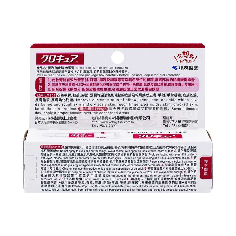 此軟膏改善手肘、膝蓋、腳踝及腳跟等有深暗色部位的粗糙,讓該部位的肌膚變得嫩滑。高濃度去角質成分20%尿素能軟化並去除深暗色的老化角質層、死皮及鱗狀皮膚,修護並防止皮膚角化。配合促進代謝成分,促進皮膚修復再生,令肌膚回復正常柔滑嫩白狀態。