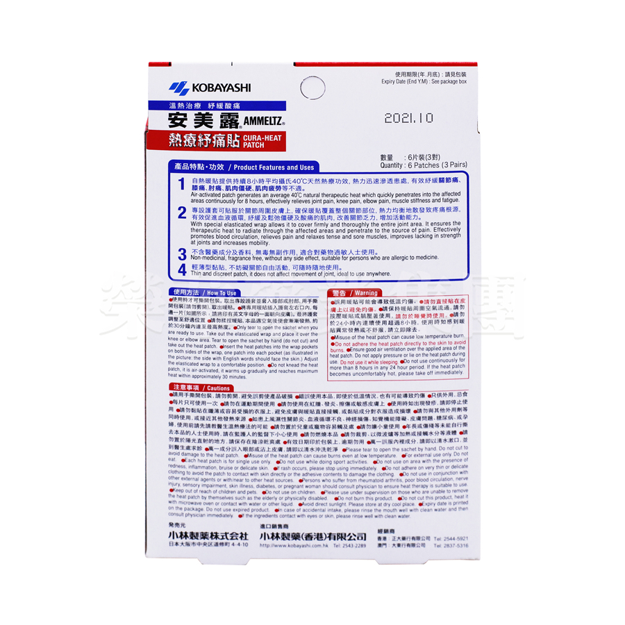 只供外用﹐忌食。請勿讓小童使用。年長或傷殘等未能自行撕去本品的人士使用時,請在監護人的監督下小心使用。•使用時才可撕開包裝﹐取出專設護套並套入膝部或肘部﹐用手撕開包裝(請勿剪開)﹐取出暖貼﹐將專用暖貼插入護套左右口內﹐每邊一片(請將印有字的一面朝向皮膚)﹐最後將護套調整至舒適位置。請勿揉捏﹐本品遇空氣後便會漸漸發熱﹐約於30分鐘內達至最高熱度。