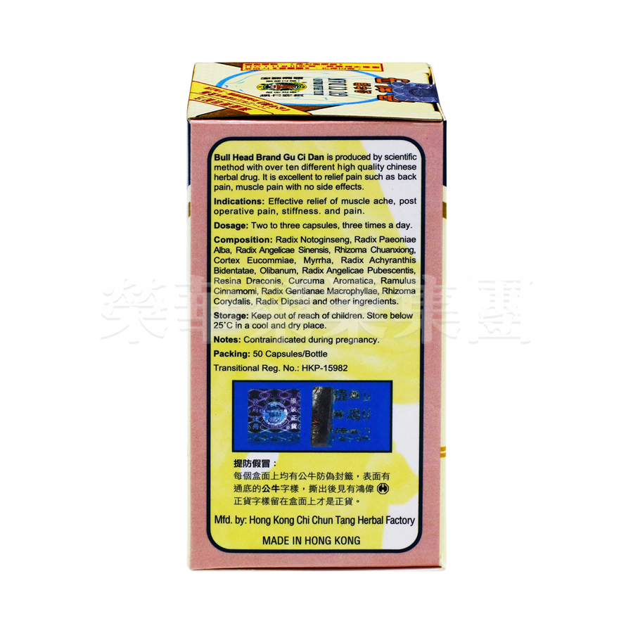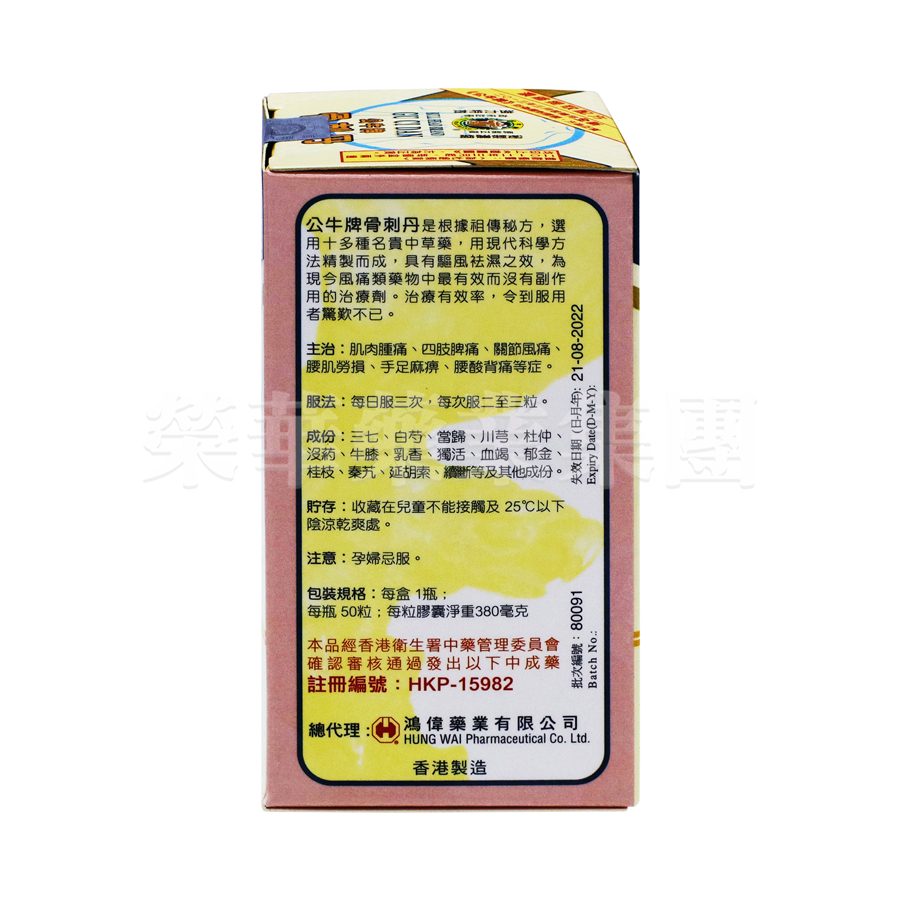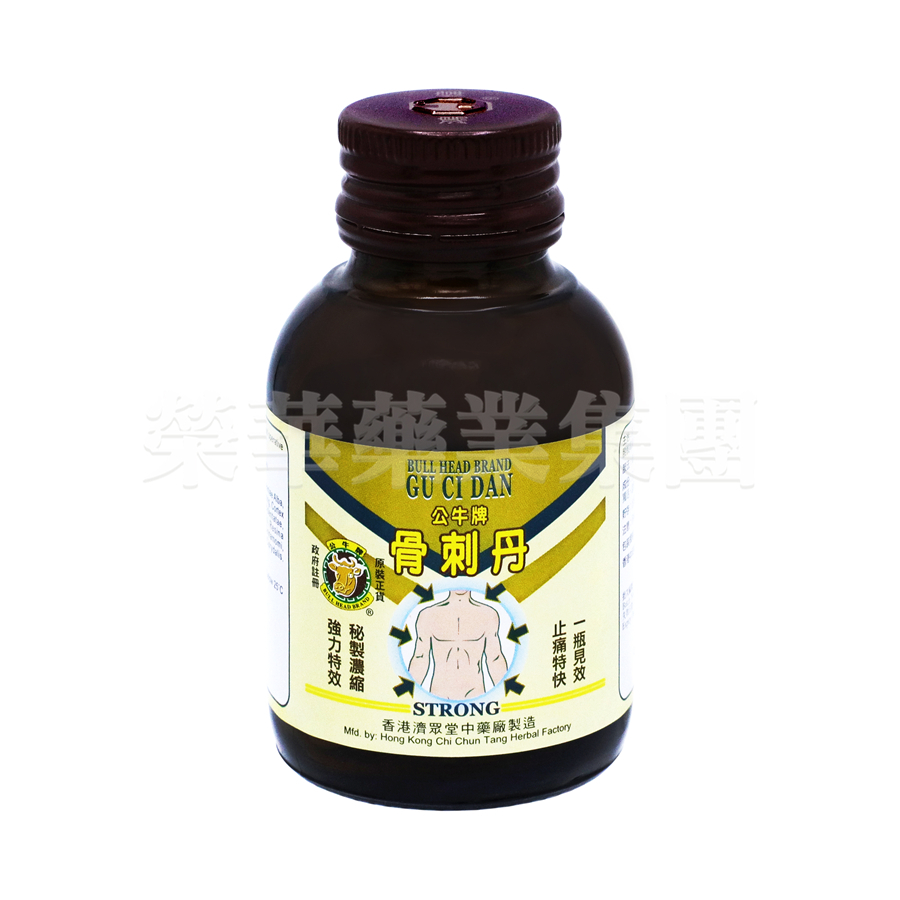 公牛牌骨刺丹是根據祖傳秘方,選用十多種名貴中草藥,用現代科學方法精製而成,具有驅風袪濕之效,為現今風痛類藥物中最有效而沒有副作用的治療劑。治療有效率,令到服用者驚歎不已。袪風除濕、活血止痛、舒筋通絡。主治肌肉腫痛、四肢脾痛、關節風痛、腰肌勞損、手足麻痹、腰酸背痛等症。