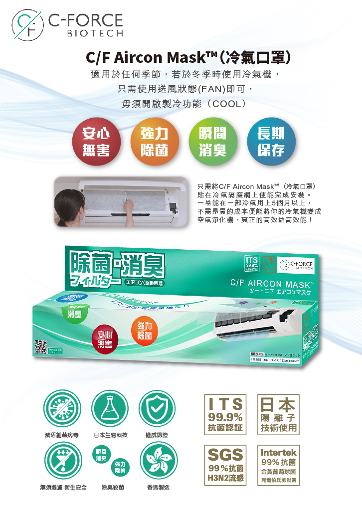 C/F Aircon Mask™不但能徹底直接殺滅細菌病毒,而且方便易用。使用日本陽離子技術,可有效滅活空氣中帶負極的細菌病毒包膜結構。