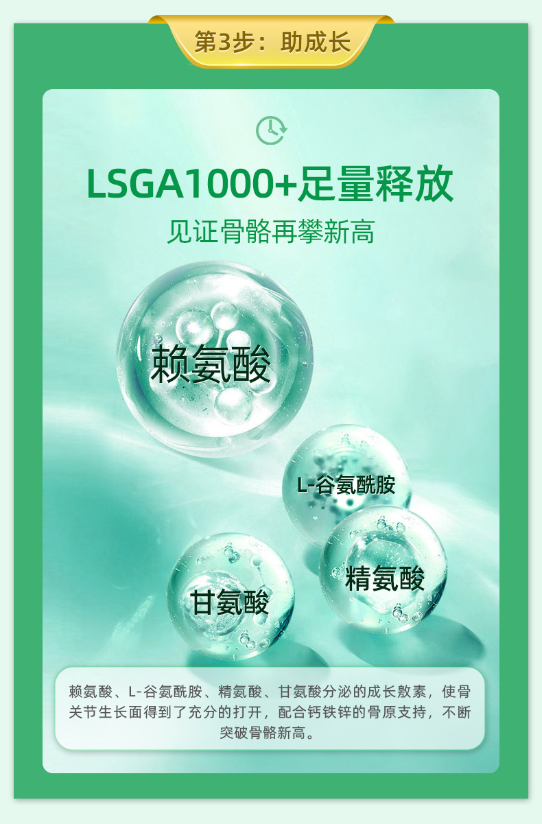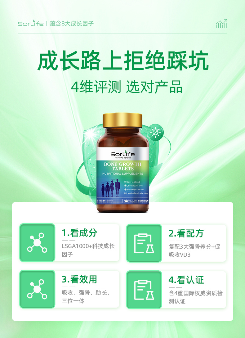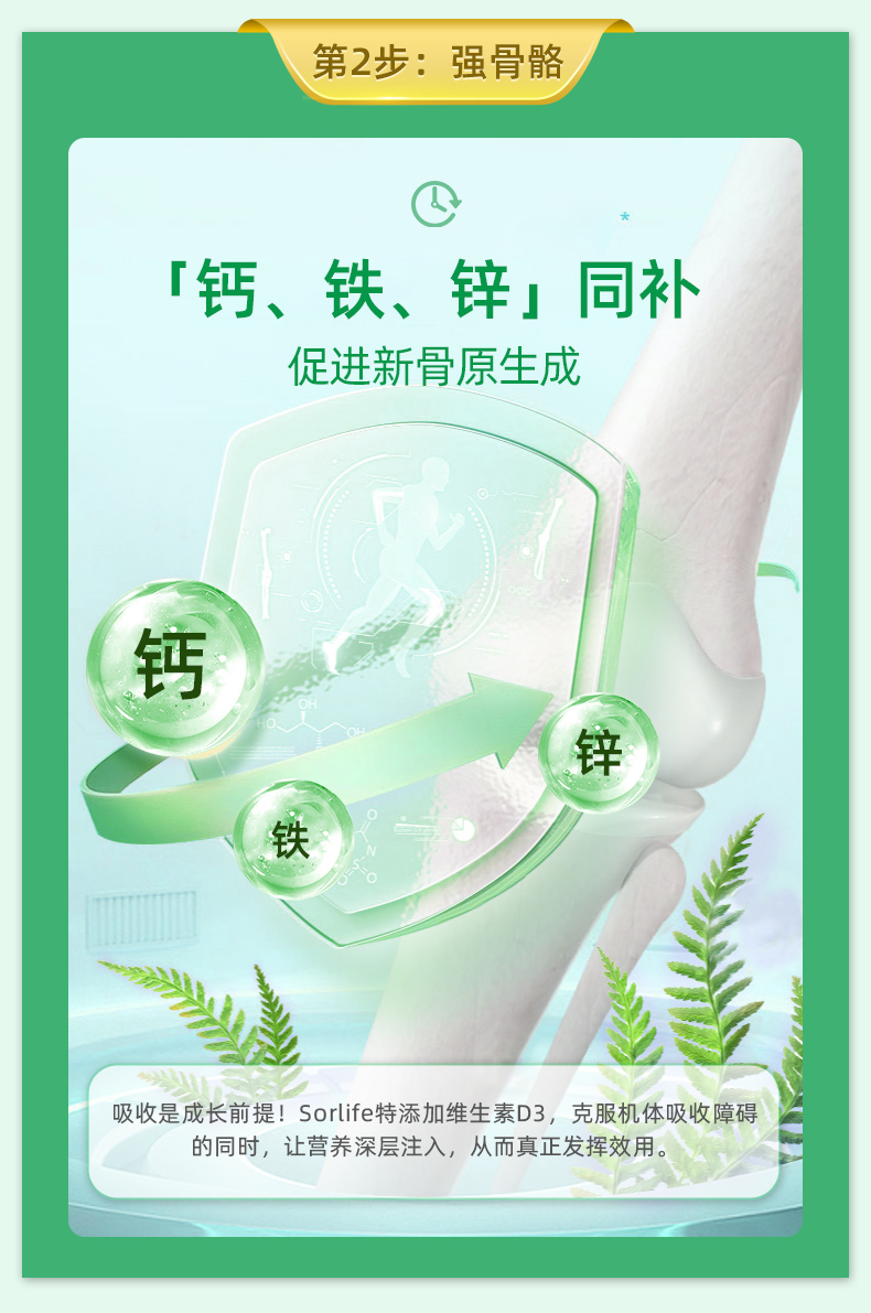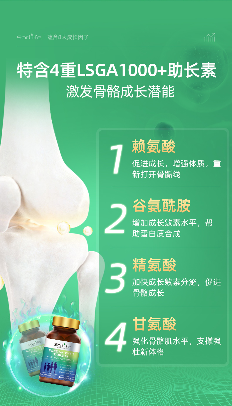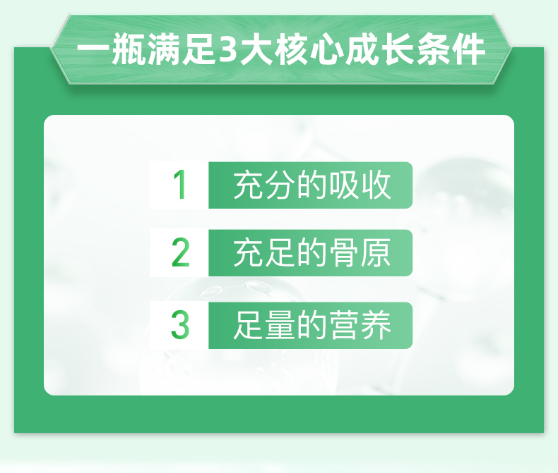 提供骨骼生長必要的營養元素,轉鈣入骨,強健骨骼;同時激活骨骼自身的原動力、促進骨骼的伸長,雙向結合;提高青少年食慾、提高智力和增強體質;降低日常骨質流失,維持增加骨密度,預防骨質疏鬆;預防結腸癌及減少肥胖
