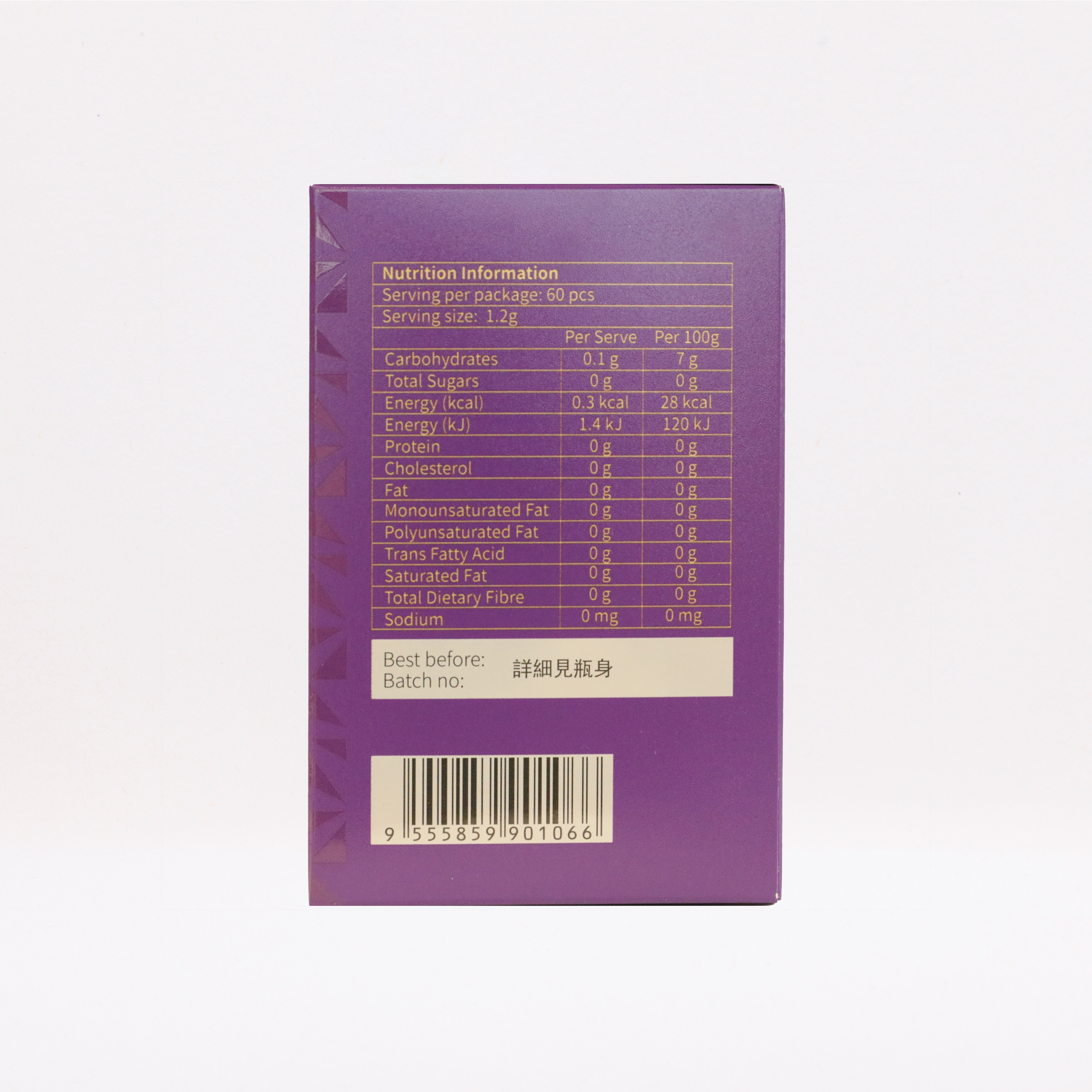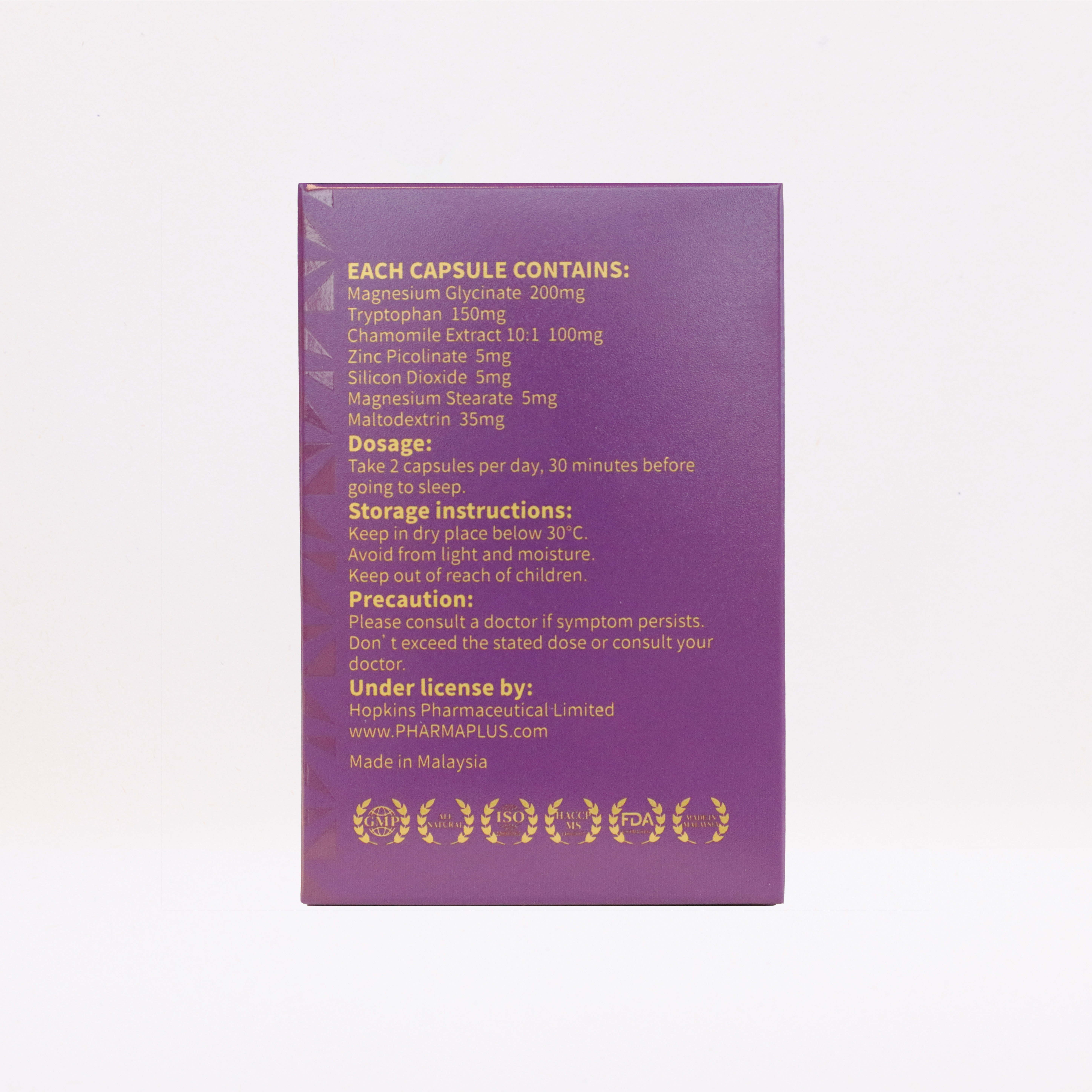 鎂甘氨酸,色氨酸,洋甘菊萃取 (10:1),鋅皮克林酸鹽 ,二氧化矽,鎂硬脂酸鹽 ,麥芽糊精