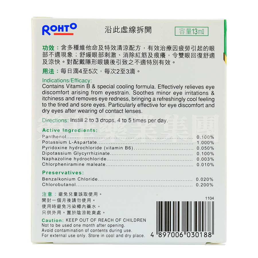 含多種維他命B及特效清涼配方,有效治療因疲勞引起的眼部不適現象;舒緩眼部刺激、消除紅筋及痕癢,令雙眼回復舒適及涼快。