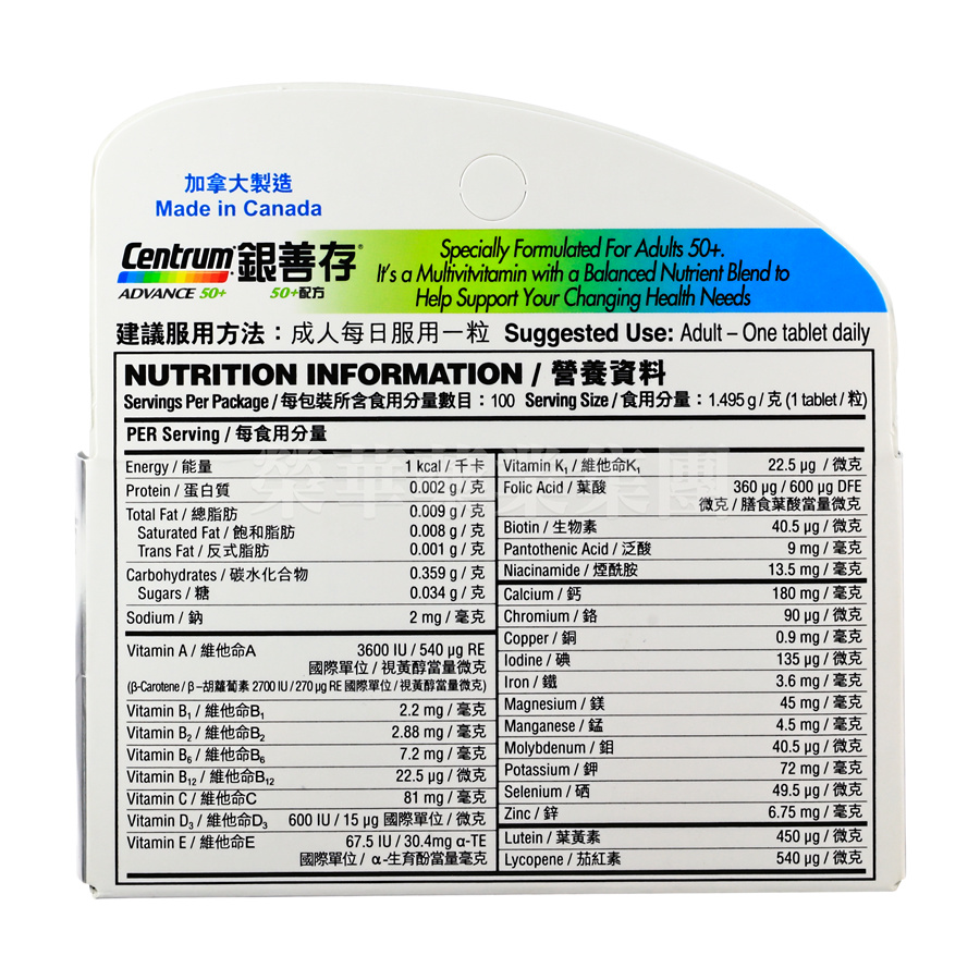 專為50歲以上人士研製的多種維他命及礦物質補充劑,提供全面營養素由A至Zinc〈鋅〉,助您提升活力和免疫力,新配方添加葉黃素及茄紅素亦有助保護眼睛和心臟,鞏固長期健康。
