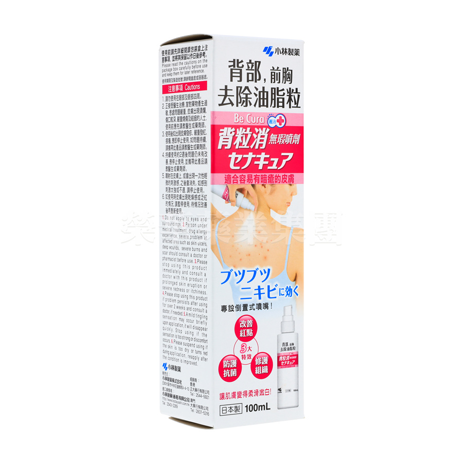 小林製藥麗治背粒消無瑕噴劑,一次達到抗菌、改善紅點、修復組織的3大功效,助你輕鬆解決毛孔閉塞,背部及前胸的油脂粒及皮膚粗糙等煩惱,令背部及前胸肌膚變得嫩滑無比。