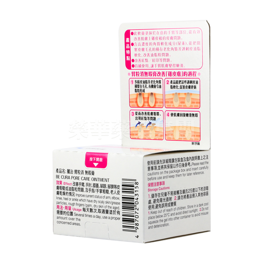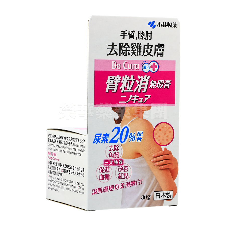 日本小林製藥麗治臂粒消無瑕膏(去雞皮),含有高濃度的角質軟化成份(尿素),能有效改善肌膚上雞皮般的皮膚問題。其成分尿素能把阻塞皮膚毛孔的積存老化角質及過剩皮油脂軟化,只需塗在有需要部位,如手臂,即可改善油脂粒問題。