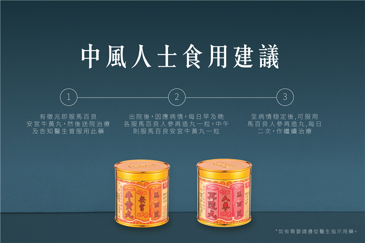 (1)中風及嚴重中風:發作時即服,每次一丸,每日二次,嚴重中風,每日三次,甦醒後兼每日早晚各服馬百良人參再造丸一粒,中午則服馬百良安宮牛黃丸一粒,至病情穩定後,可服馬百良人參再造丸,每日二次,作繼續治療及調理。(2)小兒痙瘚,高熱:即服半丸以救急。(3)癲癇發作,昏迷不醒之症,每日服2~3丸,清熱除痰,定驚開竅。(4) 四時瘟病,流行時疫,每星期服2~3丸以抗瘟病傳染。